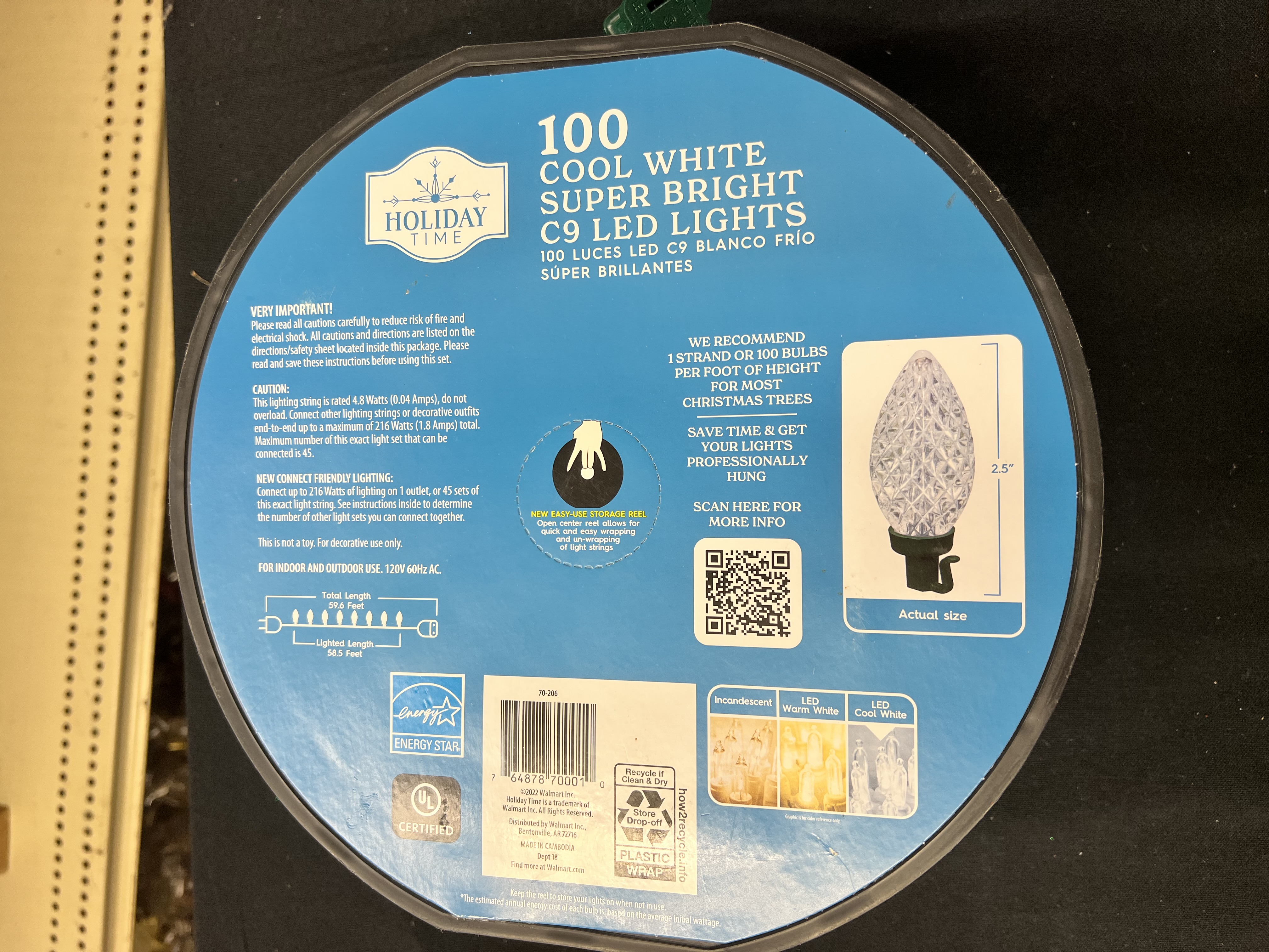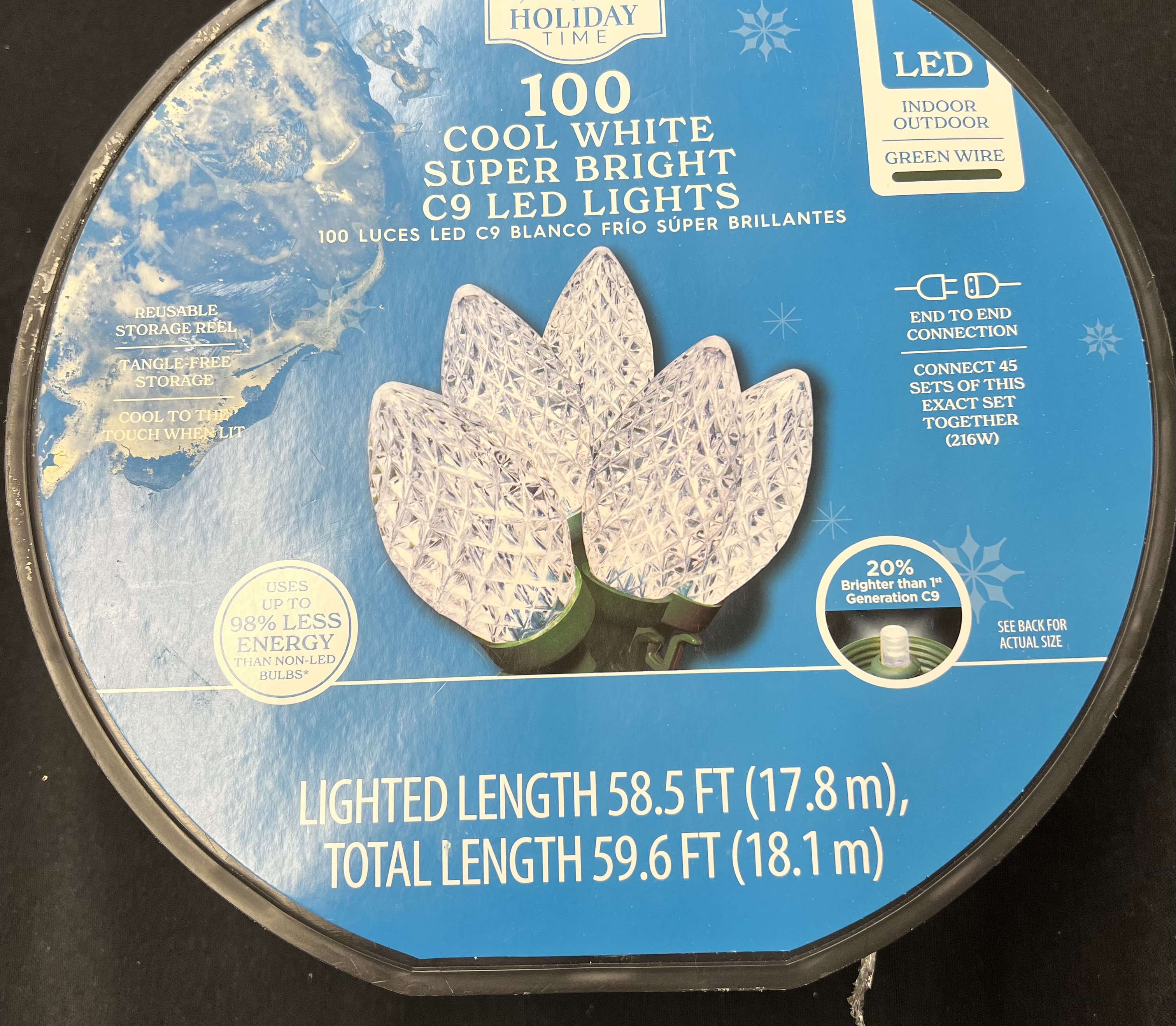 The Holiday Time 100-Count Diamond-Cut LED C9 Christmas Lights will bathe your home and holidays in brilliance. This light set features 100 diamond-cut bulbs for a gorgeous sparkling lighting effect across 58.5 feet inside and outdoors. These LED Christmas lights help save energy and remain cool to the touch even when lit. Connect up to 45 strings of this exact set of lights to create an incredible holiday display sure to delight your family, friends, neighbors, and holiday guests. The Holiday Time Diamond-Cut LED C9 Christmas Lights are crafted with a green wire in a tangle-free design to blend in perfectly with branches and other greenery. They come in 6 festive colors: Warm White, Cool White, Multicolor, Red, Blue, and Red/Warm White. The decorating possibilities are endless with the Holiday Time 100-Count Diamond-Cut LED C9 Christmas Lights.