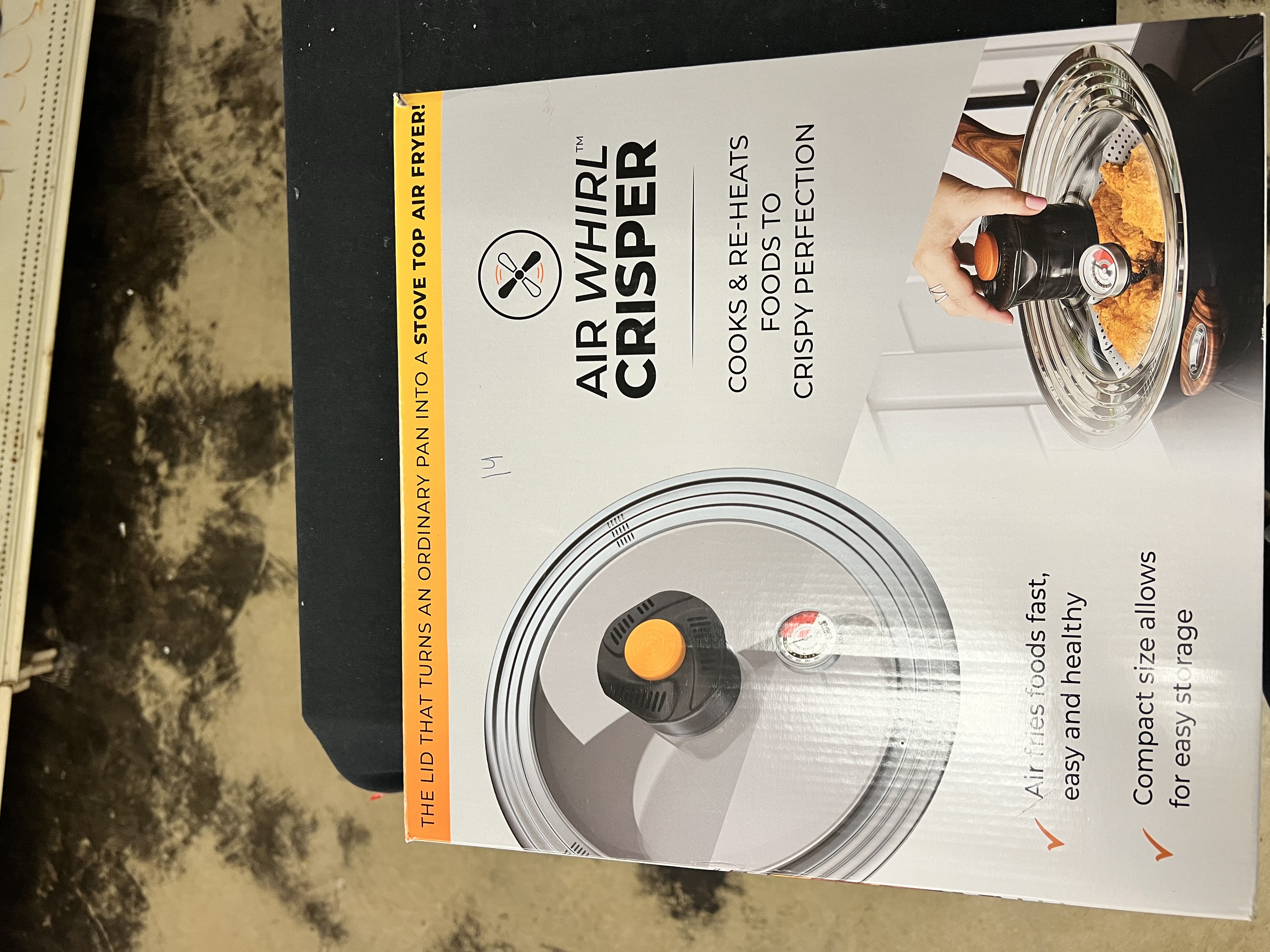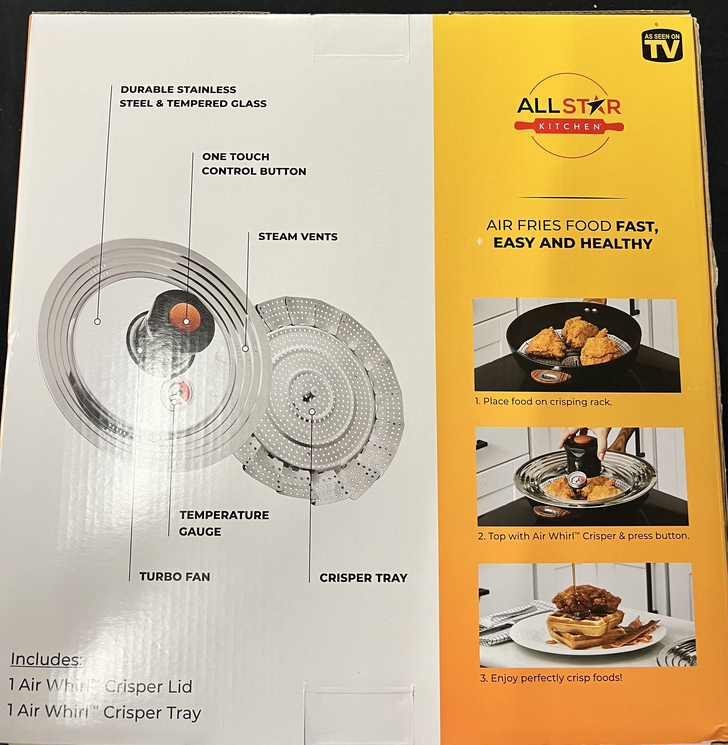 Turn your regular pan into a stovetop air fryer with our New Air Whirl Crisper. Designed to fit most pots and pans, it instantly converts them into an air fryer! Just place food on the crisping rack in your favorite pan, add the Air Whirl crisper lid, and press the one-touch control button. Enjoy perfectly crisp food in no time. The Air Whirl frying lid works with 10, 11, or 12-inch pans with a minimum depth of 1.75 inches. Elevate your cooking game today!