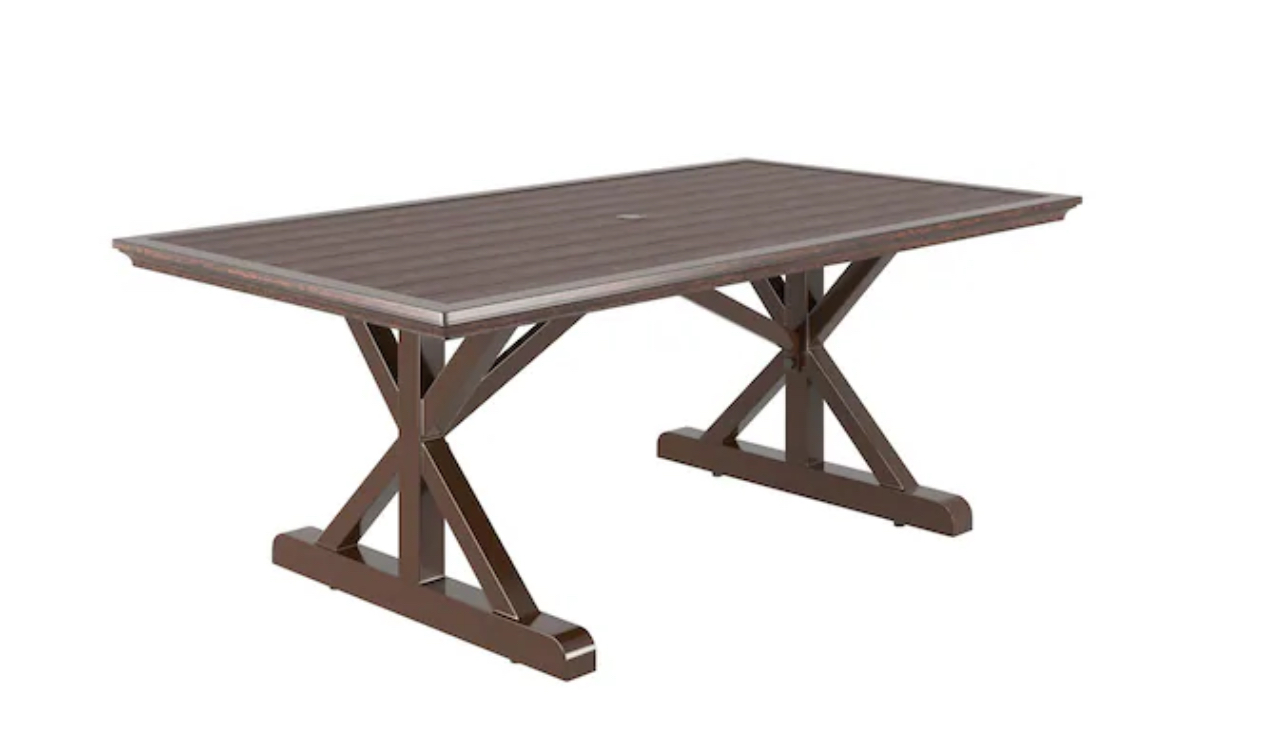 • Rectangular post leg dining table with rust-free aluminum slat top