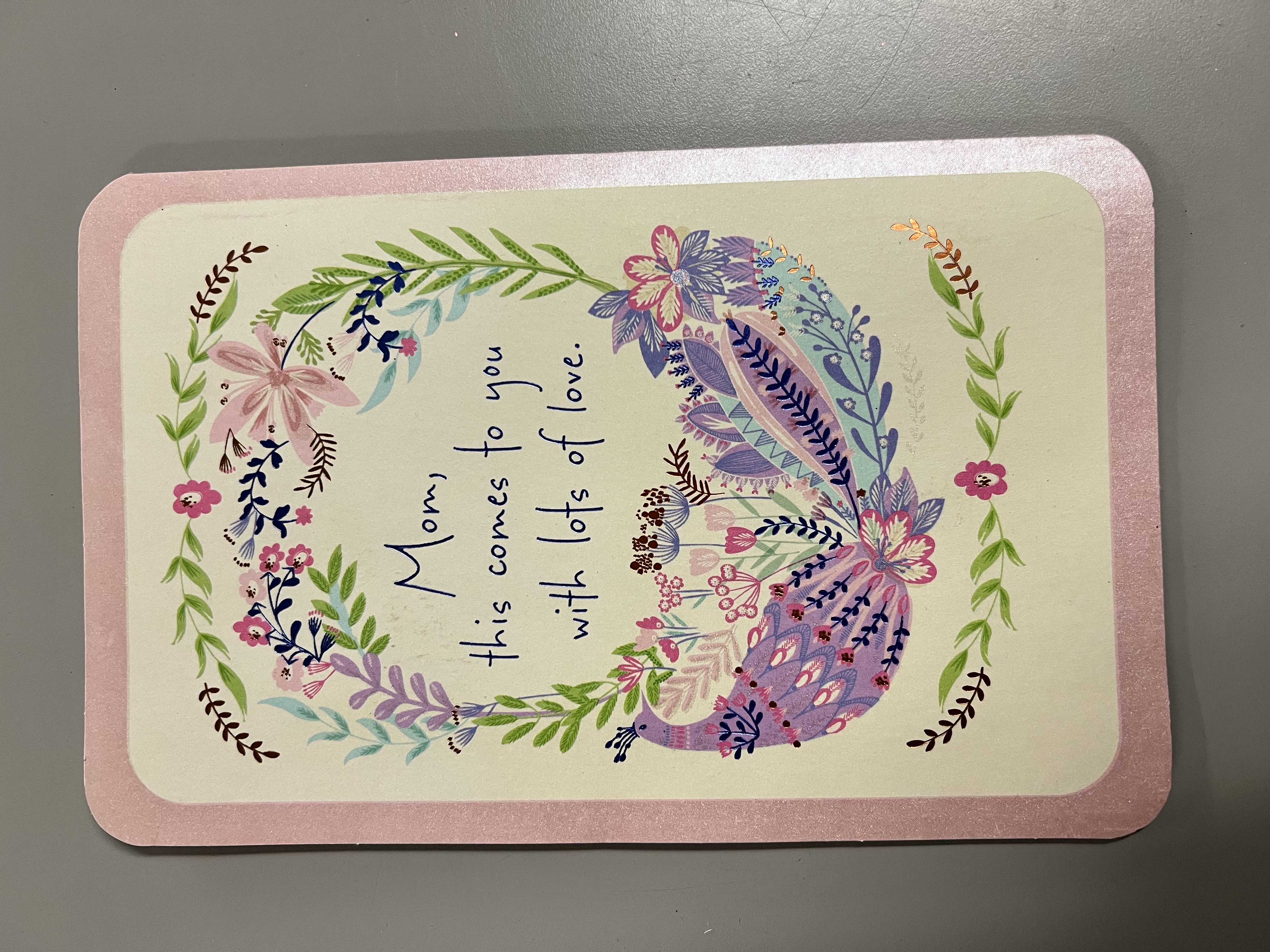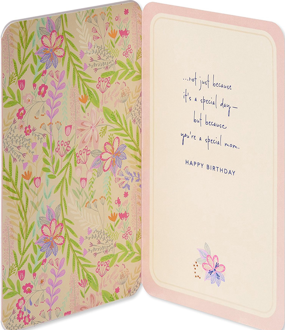 Wish your mom lots of love on her birthday! This birthday greeting card for a mom features a beautiful floral peacock design embellished with shimmering, multicolored foil and sparkling pearlescent accents. The design continues on the inside with colorful cascading foliage. The lovely design and meaningful message are sure to make her feel special on her special day!