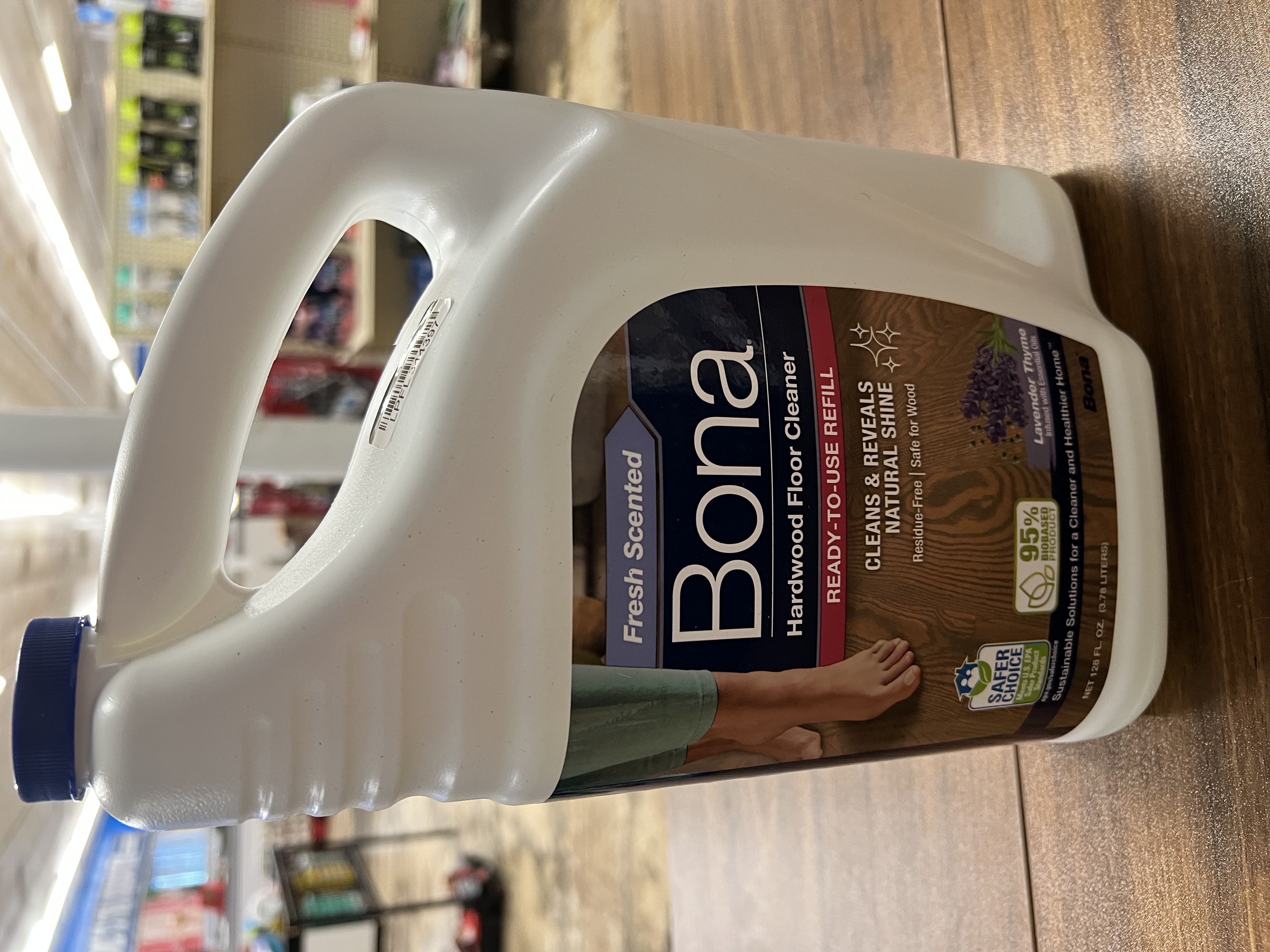 ECONOMY SIZED REFILL: Easily refill any Bona floor cleaner spray bottle or mop cartridge. CLEANER FLOORS: Residue-free, fast drying solution that gently removes dust, dirt and grime to reveal the floors natural shine. CLEANER INGREDIENTS: Always water-based and biodegradable and formulated without formaldehyde, ammonia, petroleum, phosphates, phthalates, parabens, or added dyes. QUICK & EASY TO USE: Splashless technology and a wide handle provide extra control for a smooth pour. SAFE FOR HARDWOOD: Protect your floor from discoloration and harm with our pH neutral formulation. Safe for all unwaxed, unoiled, Polyurethane finished wood floors. PLANT-BASED FORMULA: Formulation is crafted with plant-derived ingredients and contains 95% USDA certified biobased content. Meets the U.S. EPA product standards and is Safer Choice Certified for containing ingredients that are safer for people, pets, and the planet. SAVE ON PLASTIC: Bona refills save over 800,000 pounds of plastic from the landfill every year. SUSTAINABLE DESIGN: Bottle made of 30% post-consumer recycled content. FRESH SCENTED: The scent contains essential oils of lavender, thyme and lemon, and blends of lavender, light citrus, pure eucalyptus and herbaceous thyme. Packaging may vary