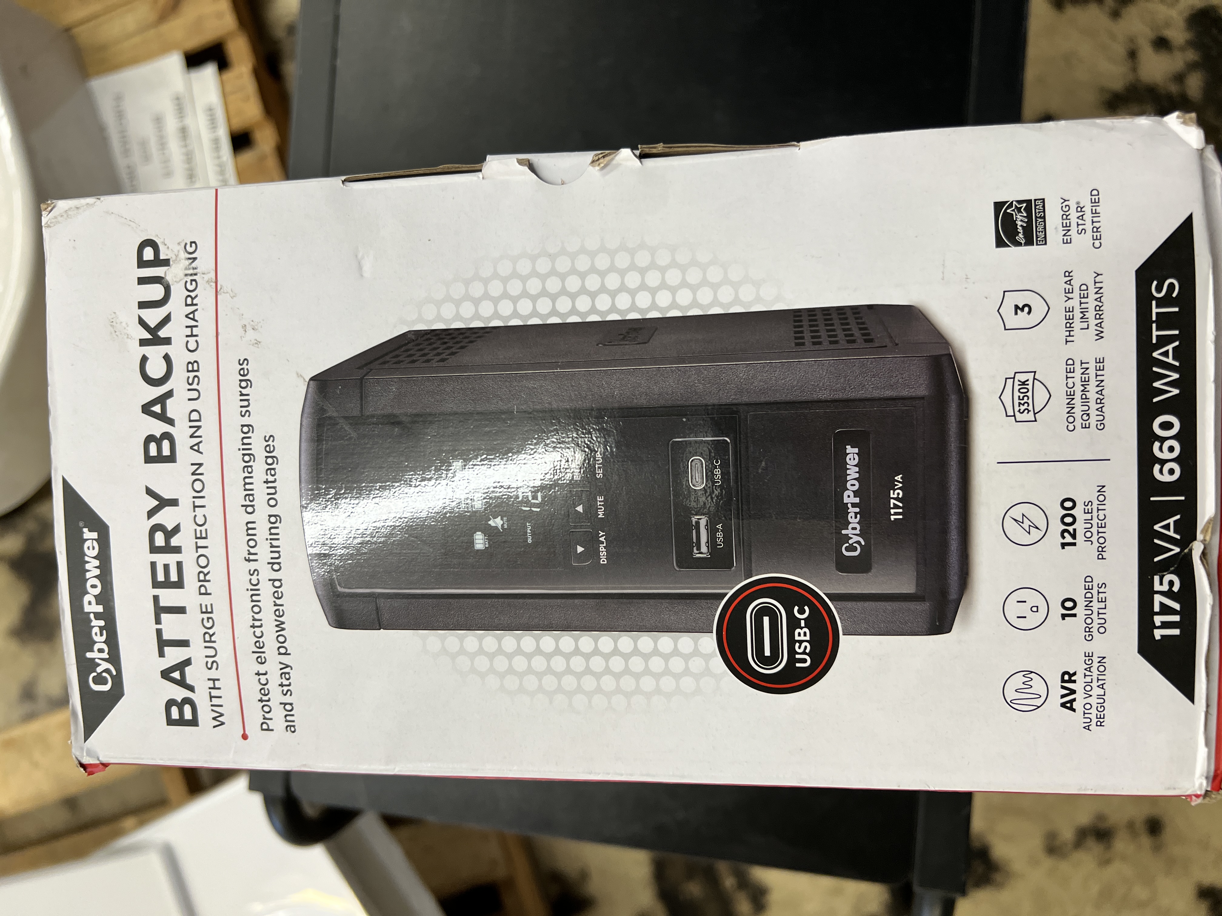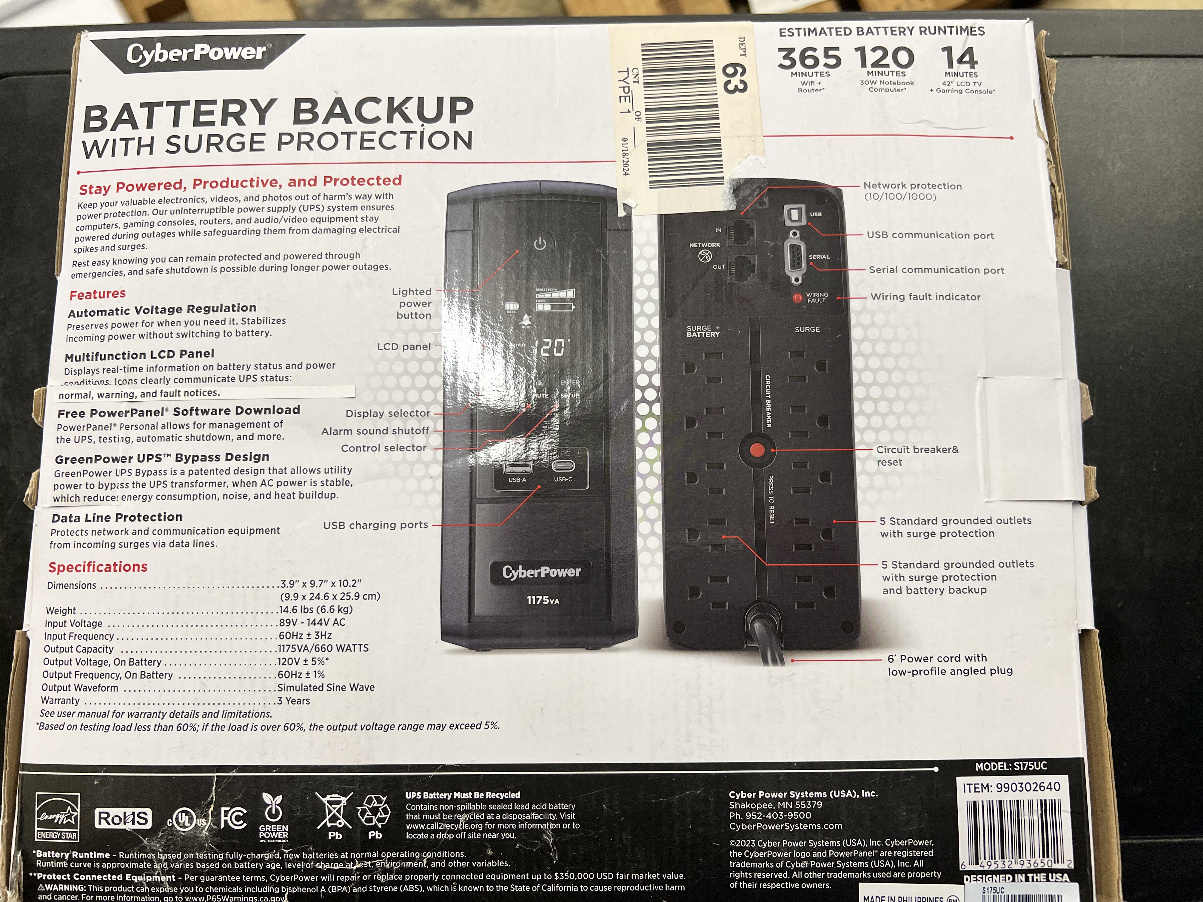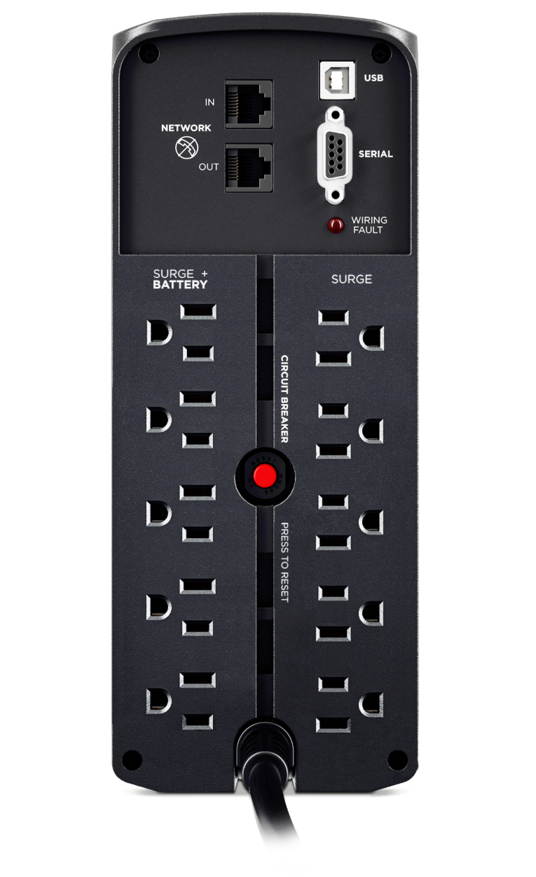 Product Overview A mini-tower UPS with line interactive topology, the CyberPower S175UC provides battery backup (using simulated sine wave output) and surge protection for desktop computers, workstations, networking devices, and home entertainment systems. The S175UC uses Automatic Voltage Regulation (AVR) to correct minor power fluctuations without switching to battery power, which extends battery life. AVR is essential in areas where power fluctuations occur frequently. Two USB charge ports power portable devices such as mobile phones and tablets, even during a utility power failure. The S175UC comes with a three year warranty (including coverage of batteries) and a $350,000 Connected Equipment Guarantee. Product Features Battery Backup Supplies power long enough for equipment to properly shut down when utility power fails, which helps prevent loss of data and minimizes the component stress caused by a hard shutdown. Surge Protection Diverts excess voltage away from sensitive electronic equipment during an AC power surge or power spike. Simulated Sine Wave Output Provides a manufactured waveform output to supply cost-effective battery backup power for equipment that does not require true sine wave output. Automatic Voltage Regulation (AVR) AVR increases the AC power and maintains a safe voltage level without switching to battery mode, conserving battery life. Multifunction LCD Panel Displays immediate, detailed information on the UPS battery and power conditions, alerting users to potential problems before they can affect critical equipment and cause downtime. USB Charge Ports Conveniently charge mobile devices. Data Line Protection Prevents power surges that travel through Ethernet lines from causing damage to electronics. ENERGY STAR This model is an ENERGY STAR® certified Uninterruptible Power Supply (UPS) system. ENERGY STAR is the trusted, government-backed symbol for energy-efficient products and practices that help save money and protect the environment. GreenPower UPS™ Bypass Design A patented design that allows utility power to bypass the UPS transformer, when AC power is stable, which reduces energy consumption, noise, and heat buildup. Ultra Quiet Design Minimizes noise during operation for a quieter work environment. PowerPanel® Personal Software Provides a user-friendly dashboard interface for controlling and monitoring the UPS. Free software download available. Three Year Warranty CyberPower will repair or replace a defective UPS system (including batteries) within five years of the purchase date*. See warranty for details. Connected Equipment Guarantee CyberPower will repair or replace properly connected equipment if it is damaged by a power surge.