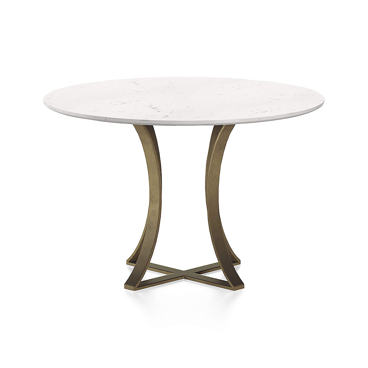 Sophisticated materials engage in modern geometry to shape this elegant dining table. Brass-finished iron curves the open pedestal base that supports a round top of beautifully veined white marble. At home in the modern or classic dining room, the Damen table seats four. Damen 48" White Marble Top Dining Table. 48"Wx48"Dx30"H Polished white marble top Base Sold Separately Seats 4 Because marble is a natural material, veining and coloring variations will occur Although dark veining is common, each marble top is unique and will display its own unique veining and color tones; view additional images for examples of variance Made in India