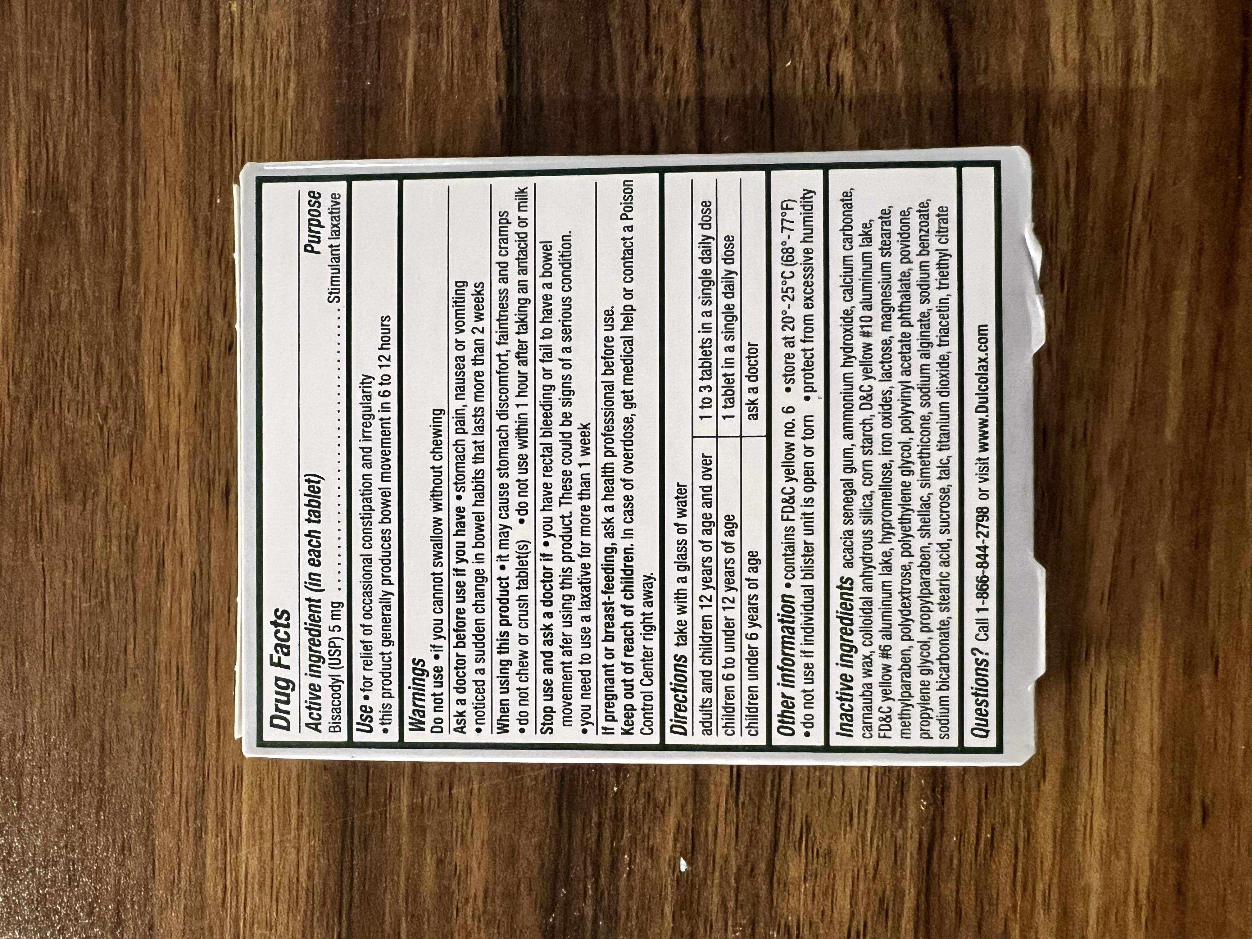 Trusted for guaranteed relief. Active Ingredients: Bisacodyl USP 5 mg Inactive Ingredients: Acacia; Acetylated Monoglyceride; Carnauba Wax; Cellulose Acetate Phthalate; Corn Starch; Dibutyl Phthalate; Docusate Sodium; Gelatin; Glycerin; Iron Oxides; Kaolin; Lactose; Magnesium Stearate; Methylparaben; Pharmaceutical Glaze; Polyethylene Glycol; Povidone; Propylparaben; Red No. 30 Lake; Sodium Benzoate; Sorbitan Monooleate; Sucrose; Talc; Titanium Dioxide; White Wax; Yellow No. 10 Lake Uses: For temporary relief of occasional constipation and irregularity. This product generally produces bowel movement in 6 to 12 hours. Easy-to-swallow, comfort coated tablets are gentle enough for sensitive stomachs, yet strong enough for effective overnight relief. Relieves constipation in 6 to 12 hours. #1 doctor recommended brand*. *Among stimulant laxatives.
