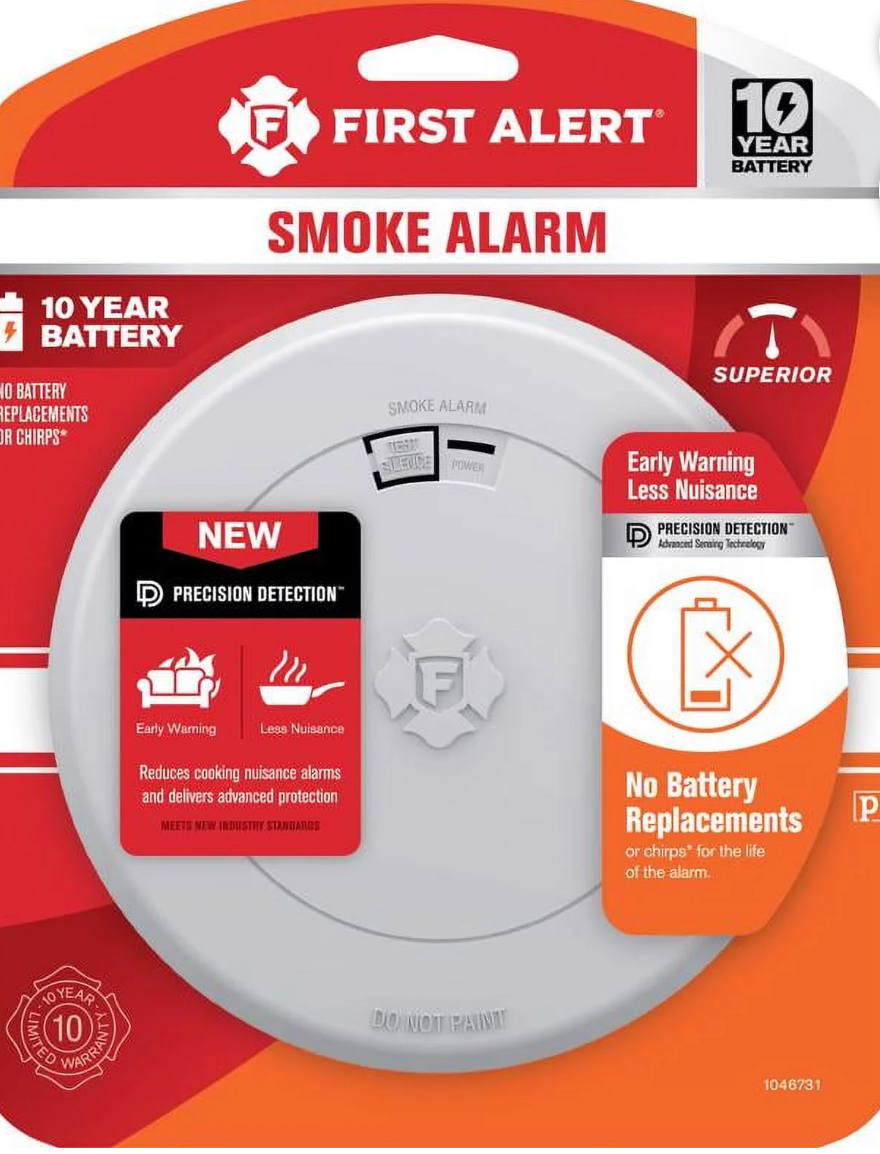 The First Alert SM210 10-Year Sealed Battery Smoke Alarm with Slim Profile Design is equipped with First Alert's Precision Detection advanced sensing technology and meets new industry standards. This slim profile smoke alarm is easy to install, and the 10-year sealed battery means no battery replacements are required.