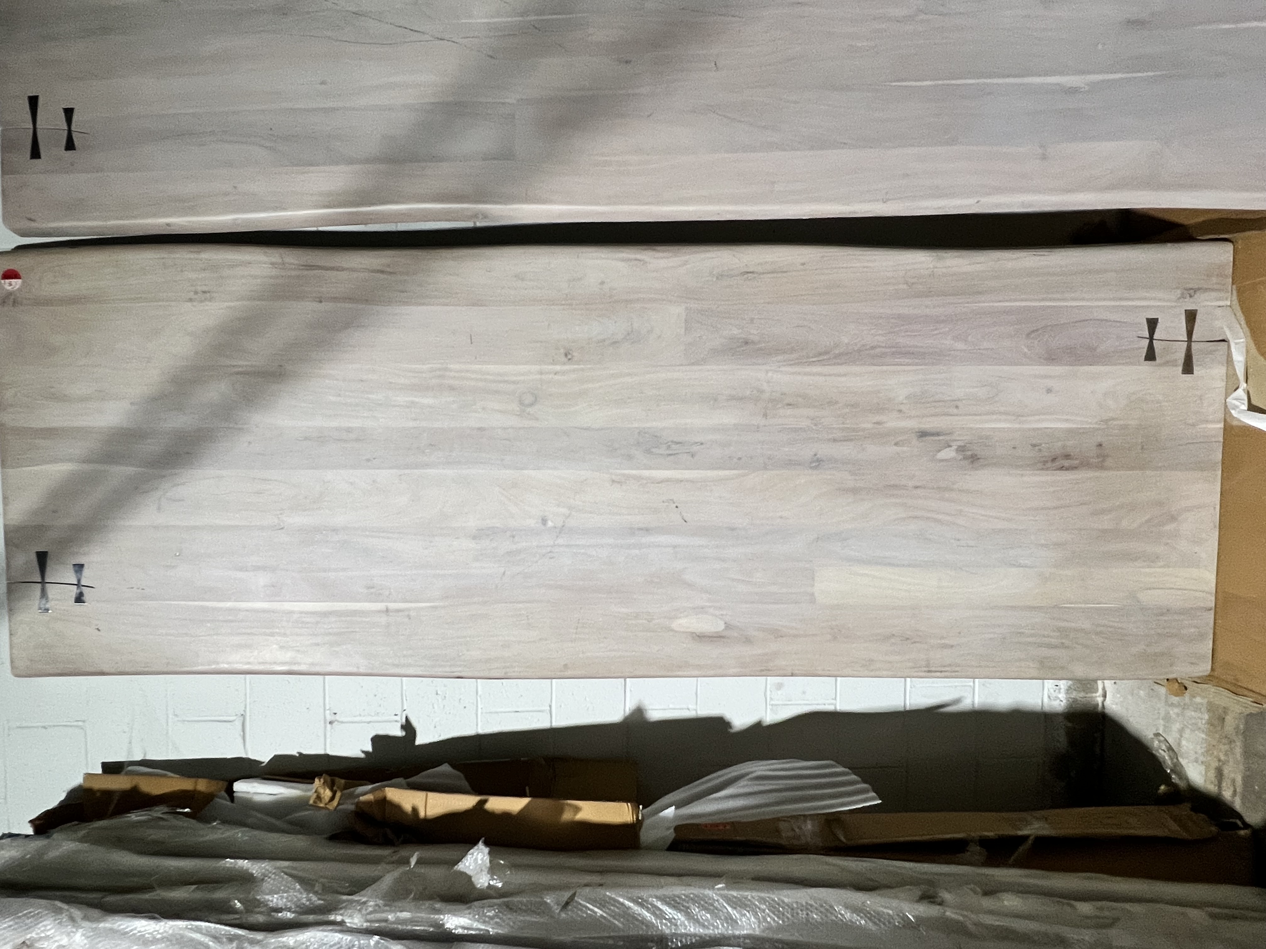 Wide acacia wood planks top off this natural beauty. Finished with a live edge and subtle whitewash, extra large dining table shows off gorgeous natural tones, knots and markings. Two stainless steel legs hold strong underneath while butterflies bridge the splits to call attention to every detail. Seats ten easy.