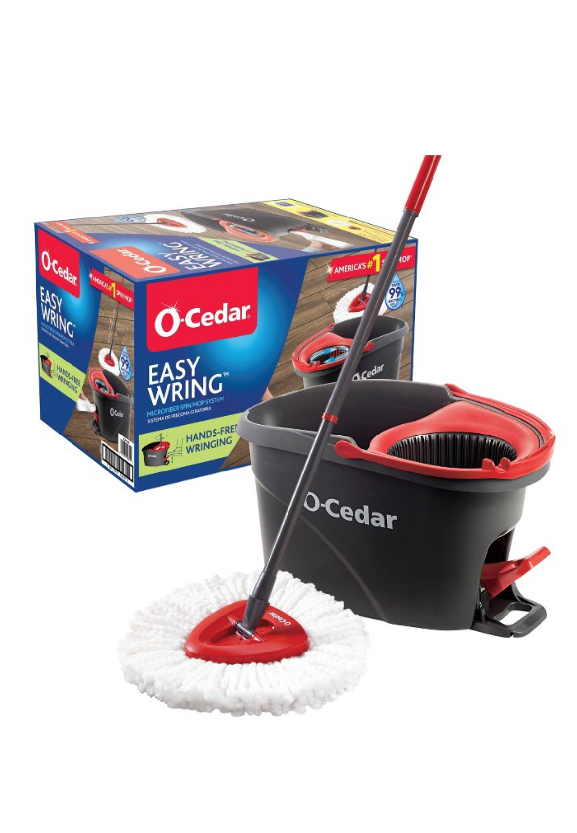 O-Cedar's EasyWring microfiber mop delivers a better clean by effectively removing dirt and grime just water. The EasyWring is a better way to truly clean your floors! The foot pedal on the bucket allows for hands-free wringing to prevent bending over and wet hands. Control the level of moisture on your mop with the built-in, high-quality foot pedal while Splash Guards keep the water inside the mop bucket. This is an ideal deep-cleaning solution for all hard floors, such as hardwood, tile, laminate, marble, and ceramic. It can be used wet or dry depending if floors need mopping or dusting. Everyone can use this mop as the telescopic handle adjusts to 51 inches. *Removes over 99% of E. coli and Staph. aureus from pre-finished hardwood flooring and ceramic tile using tap water, as tested at an independent accredited lab ***The EasyWring #1 Spin Mop claim is based on IRI, Total US MULO, L52 wks 01/01/23, Consumer Focused Durable Mops dollar sales.