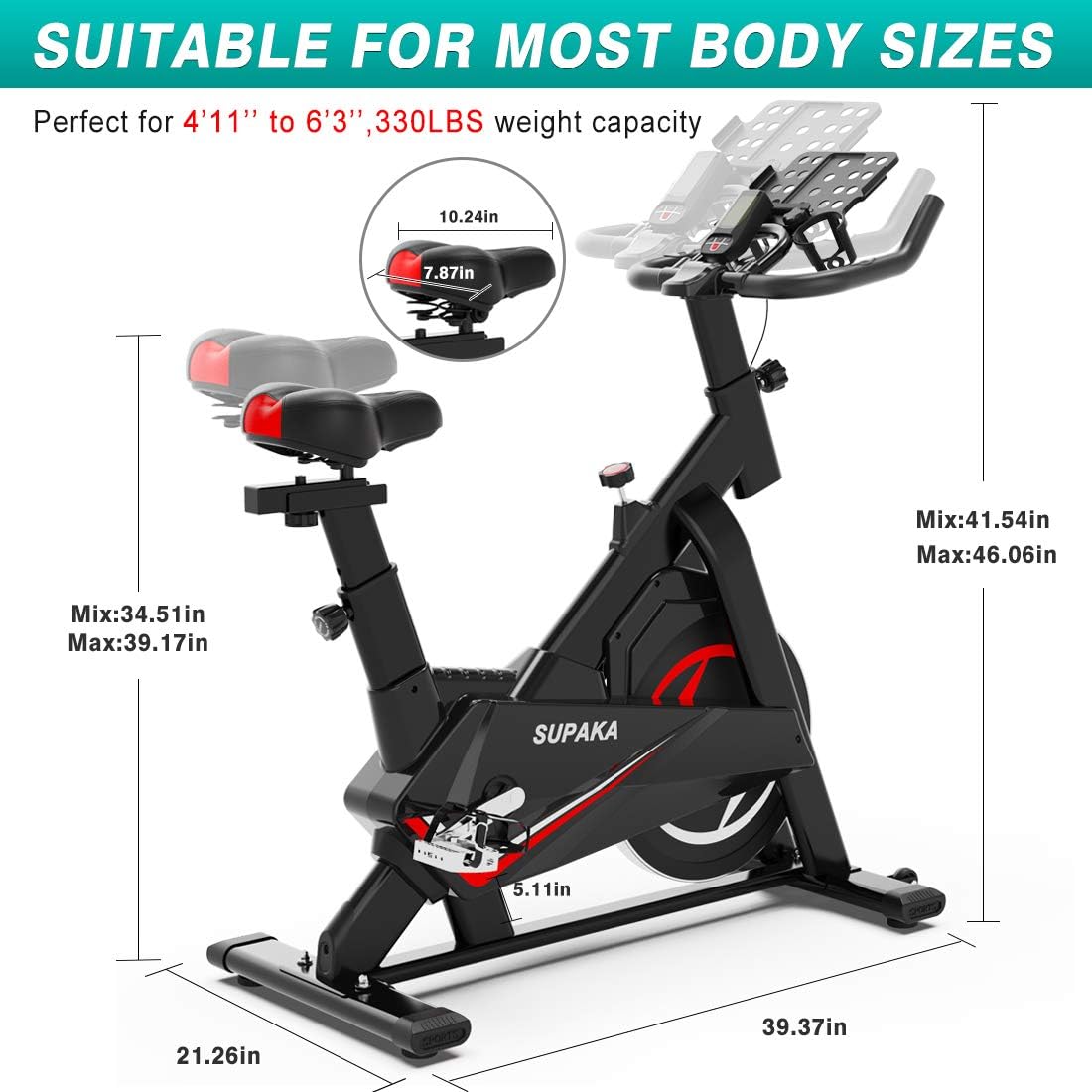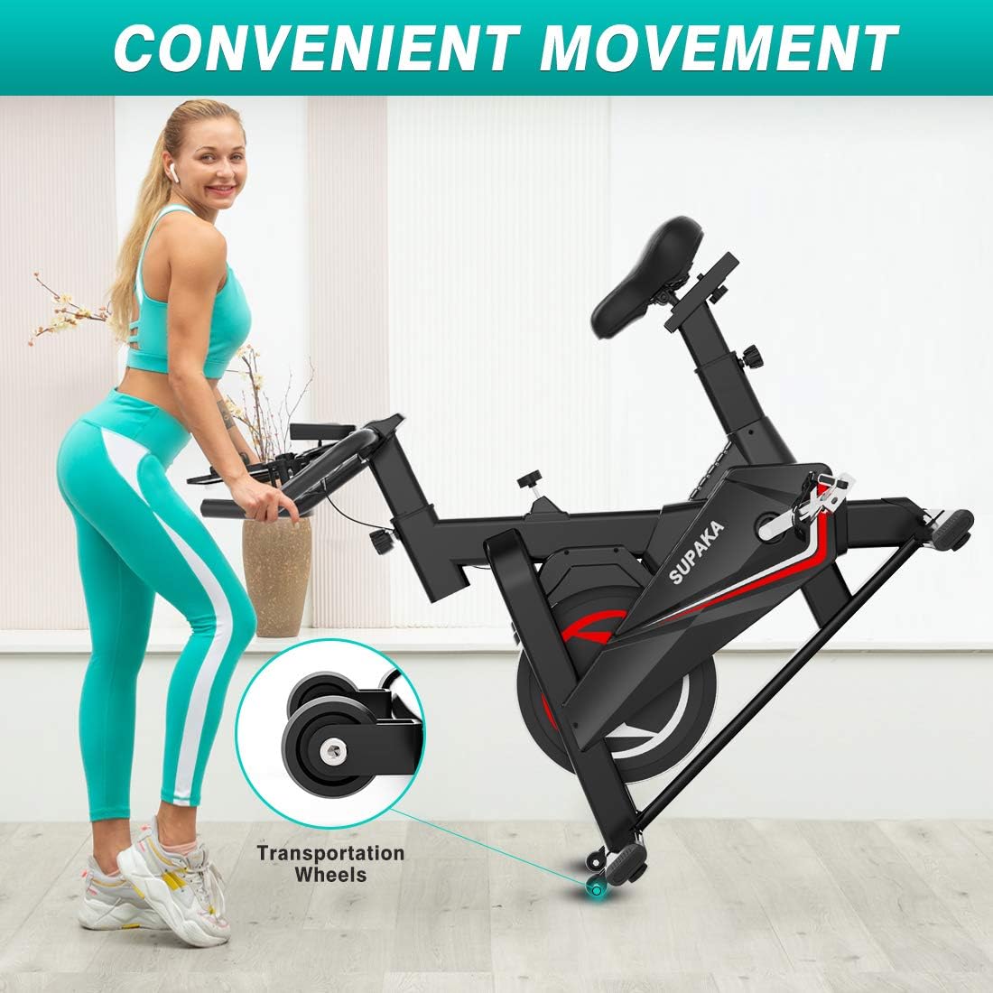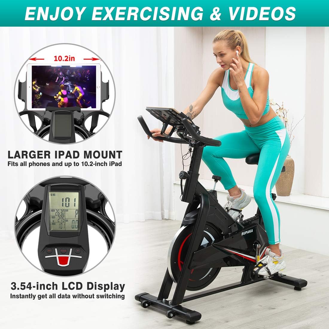 ✅【35LBS FLYWHEEL AND BELT DRIVE MECHANISM】SUPAKA spin bike with a 35lbs flywheel provides even more momentum for a challenging and real riding experience. The belt drive and magnetic mechanism allow you enjoy an incredibly smooth, quiet and steady ride. Require maintenance-free. ✅【PERSONALIZED EXPERIENCE】Adjustable 2-way non-slip handlebars and 4-way seat provide users with a customized indoor riding experience. The updated seat cushion features high density padding for more soft and shock resistance. Chips on the handlebar keep track of the heart rate. ✅【LCD DISPLAY】Indoor cycling bike is equipped with LCD display that tracks time, distance(miles), calories burned, heart rate, speed and RPM. With a display screen of up to 3.54 inches, you can instantly get all real-time data during exercise without switching. The Ipad mount is compatible with all phones and Ipad up to 10.2 inches. ✅【ADJUSTABLE MAGNETIC RESISTANCE】The tension knob of workout bike allows you to adjust magnetic resistance, giving you different levels of difficulty and providing an authentic road experience. Emergency brake is available to ensure safety whenever you want to stop. ✅【SAFE AND CONVENIENT】Cage pedal with adjustable straps can adapt to different sizes of feet without worrying about slipping, and floor levelers can easily adapt to uneven ground. Just tilt the transport wheel to move it, the exercise bike is not limited to one place in your home. We provide 180-day parts replacement service, but we are confident that you won’t need it. 100% satisfied customer service!